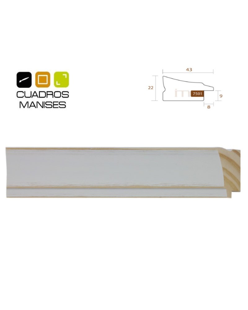 Moldura Blanca Mate para marcos. Madera Pino Finger. Ancho: 43 mm. Alto: 22 mm. Galce: 9 mm.