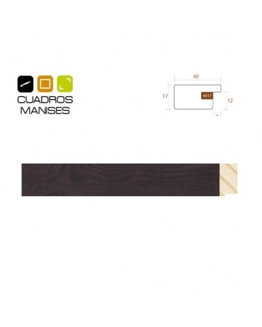 Moldura madera patinada imitación nogal para marcos. Madera Pino Finger. Ancho: 40 mm. Alto: 17 mm. Galce: 12 mm.