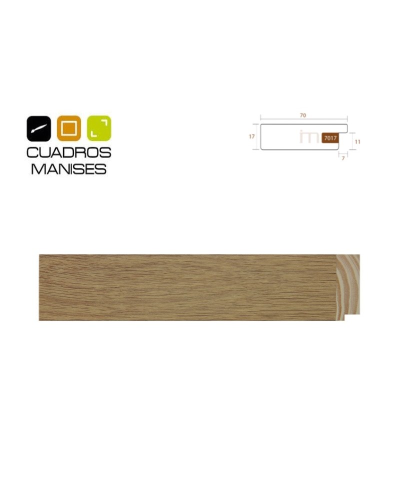 Moldura madera imitación roble para marcos. Madera Pino Finger. Ancho: 70 mm. Alto: 17 mm. Galce: 11 mm.