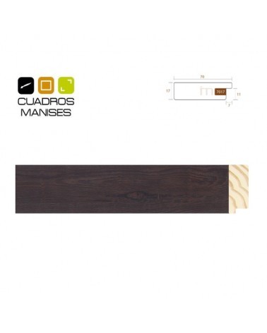 Moldura madera patinada imitación nogal para marcos. Madera Pino Finger. Ancho: 17 mm. Alto: 70 mm. Galce: 11 mm.