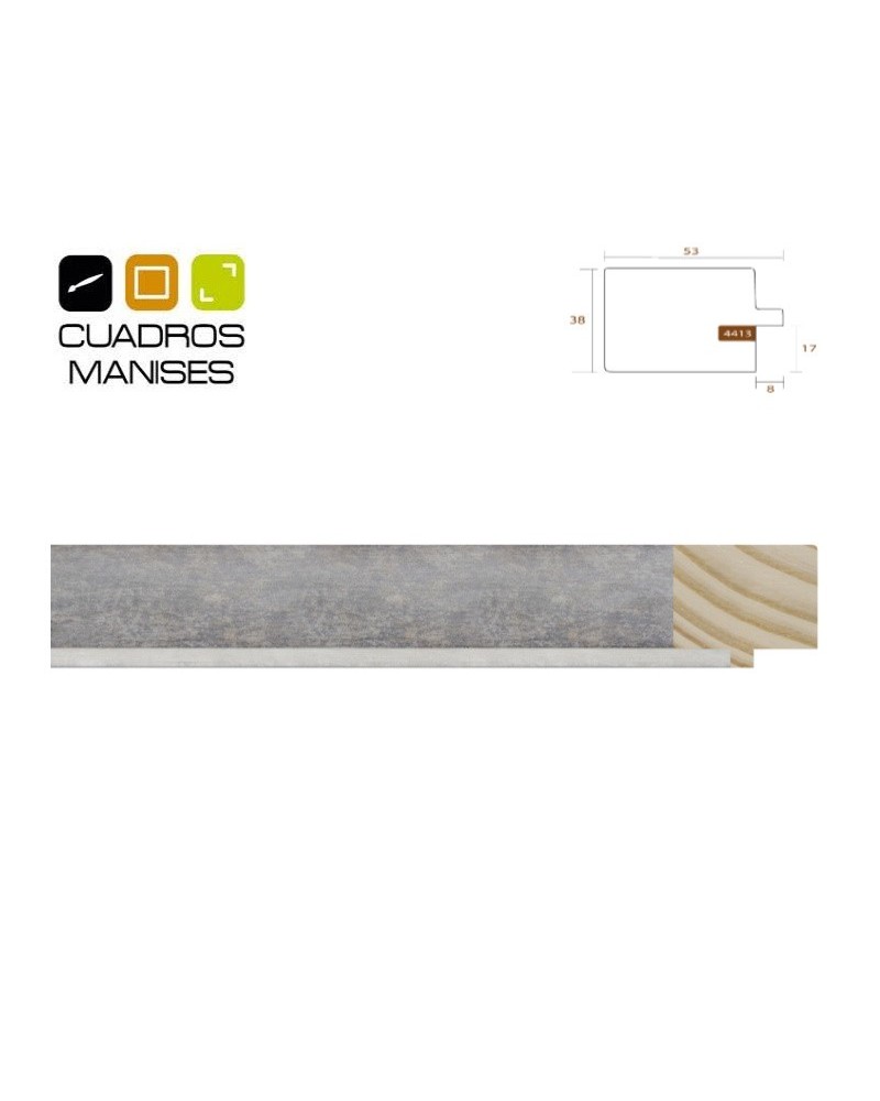 Moldura Bicolor Plata para marcos. Madera Pino Finger. Ancho: 53 mm. Alto: 38 mm. Galce: 17 mm.
