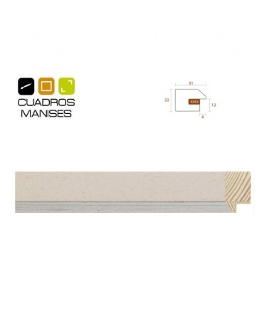 Moldura Blanca Mate con filo Plata para marcos. Madera Ayous. Ancho: 31 mm. Alto: 22 mm. Galce: 12 mm.