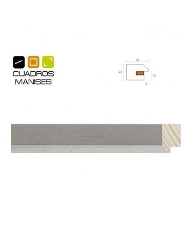 Moldura Gris Claro con filo Plata para marcos. Madera Ayous. Ancho: 31 mm. Alto: 22 mm. Galce: 12 mm.