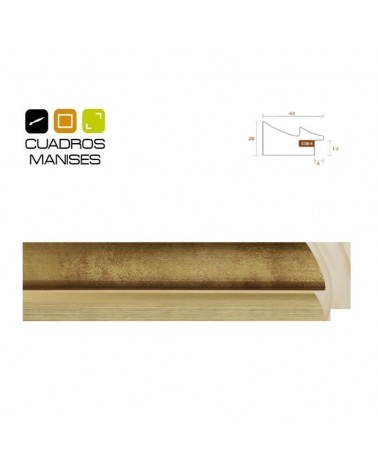 Moldura Color Oro envejecido para marcos. Madera Pino Finger. Ancho: 43 mm. Alto: 28 mm. Galce: 12 mm.