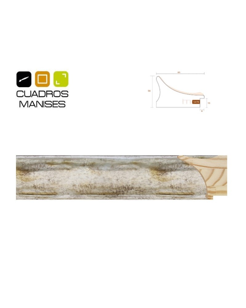 Moldura color Plata envejecida para marcos. Madera Pino Finger. Ancho: 85 mm. Alto: 56 mm. Galce: 16 mm.